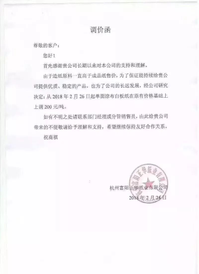 杭州富阳鑫源纸业有限公司:自2018年2月23日起,白板纸在现价格基础上上调100元/吨;原有未完成订单在此调价范围内。