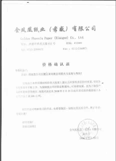 金凤凰纸业(孝感)有限公司:从2018年2月25日起在原有的价格基础上本公司产品上调300元/吨。
